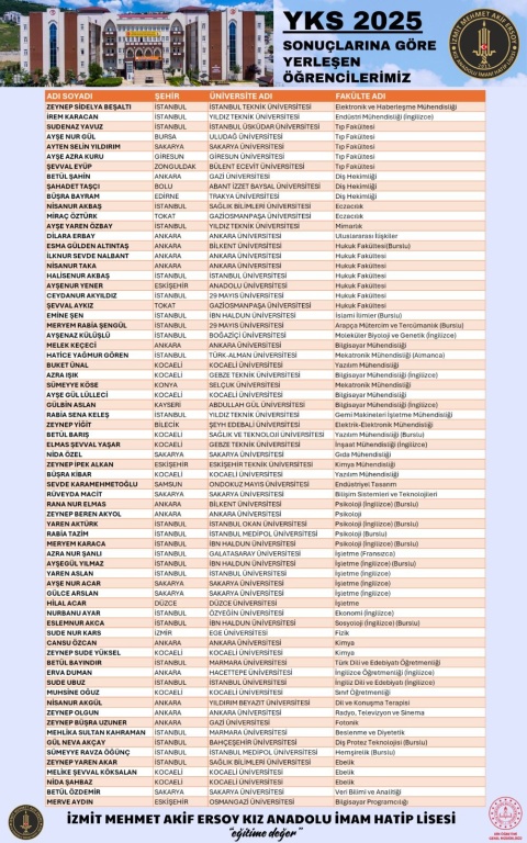 2025 Yılında YKS le üniversiteye yerleşen öğrencilerimzin toplu listesi. Tüm öğrencilerimizie başarılar dileriz..