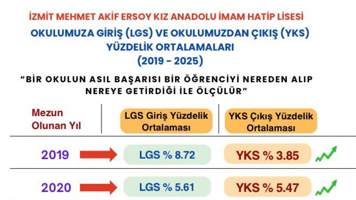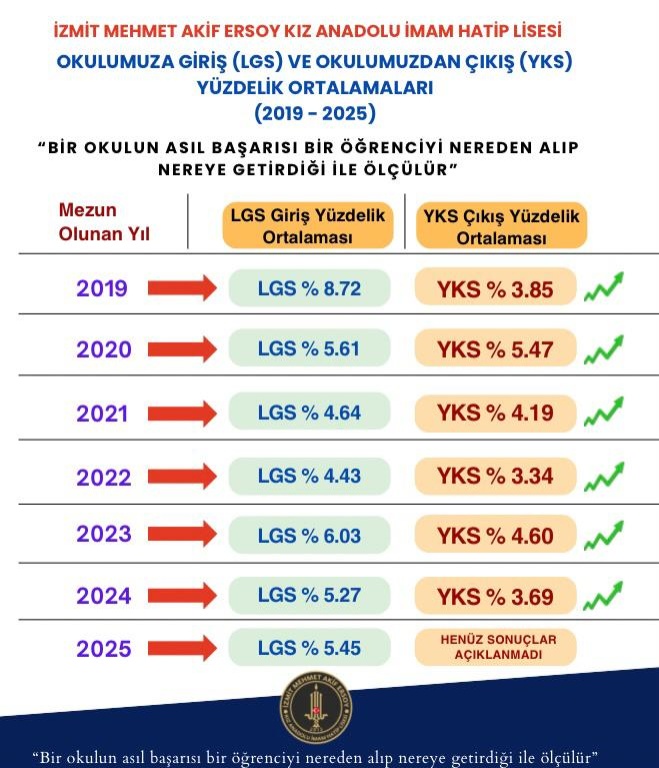 "Aşağıdaki tabloda, okulumuzun 2019–2025 yılları arasındaki LGS giriş ortalamaları ile YKS çıkış ortalamalarının karşılaştırması yer almaktadır. Veriler, okulumuzun üniversite sınavlarında sadece bireysel değil; kitlesel başarıyı yakaladığını açıkça göstermektedir."